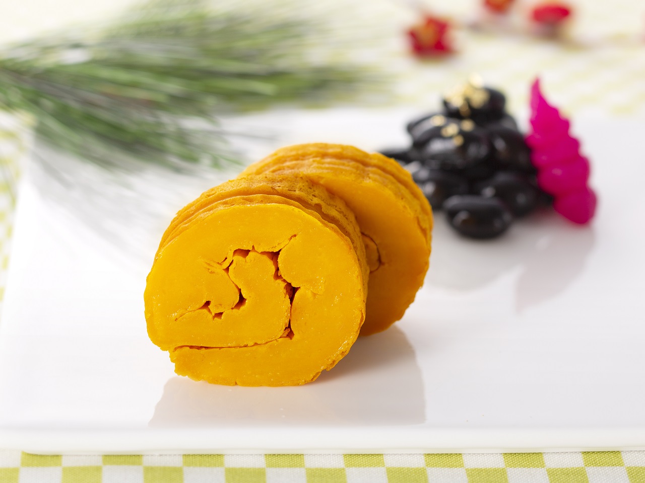 こちらもおせち料理の定番「伊達巻」。伊達巻は学業成就という願いを込めて用意されるものですが、その由来は昔の書物は巻物状になっていたため、その形に似ていることが由来だと言われています。