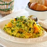 ココナッツミルクにパクチーやレンズ豆を加えたまろやかなベースに、香ばしいスパイスを効かせた、旬の野菜を美味しくいただける、南インド風のスパイスカレーです。スパイシーだけどどこか優しくホッとする風味のカレーです。お豆を使っているので、ぽってりとした仕上がりです。
