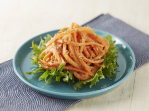 ・にんじんの皮をむき、長さ5センチ×幅3ミリくらいの細切りにします。