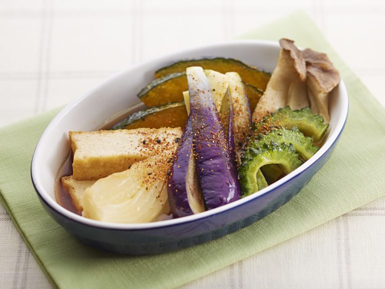 材料を切る。ナス・エリンギは5cm幅に、玉ねぎはくし切り、カボチャ・ゴーヤは7mm幅の薄切りにスライスする。厚揚げは一口大に切る。ゴーヤは5分ほど水にさらす。