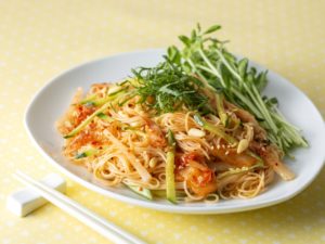 韓国料理のビビン(和える)麺を身近なそうめんを使用して納豆と共に和えました。納豆を入れると素麺とピリ辛タレの絡みが良くなり、ダイレクトに刺激的なピリ辛が味わえます。共に入れたトマトの甘酸っぱさが辛さをマイルドにしてくれるので、お好みに合わせながらお楽しみください。