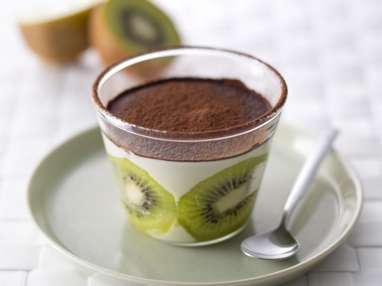 透明なカップやグラスに、キウイの断面が見えるように並べ、その上から2を入れます。