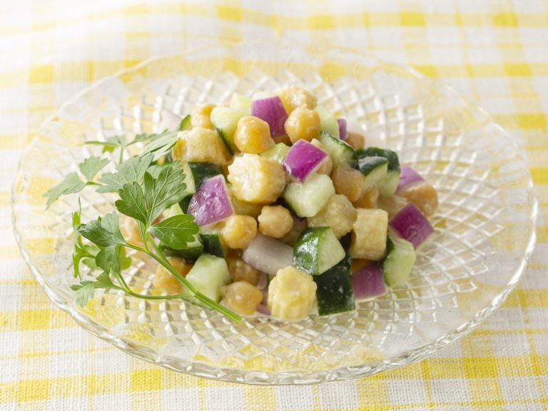 様々な夏野菜を入れて、塩麹でさっぱりとしたサラダに仕上げました。ひよこ豆も入っているので、食べ応えもバッチリです。